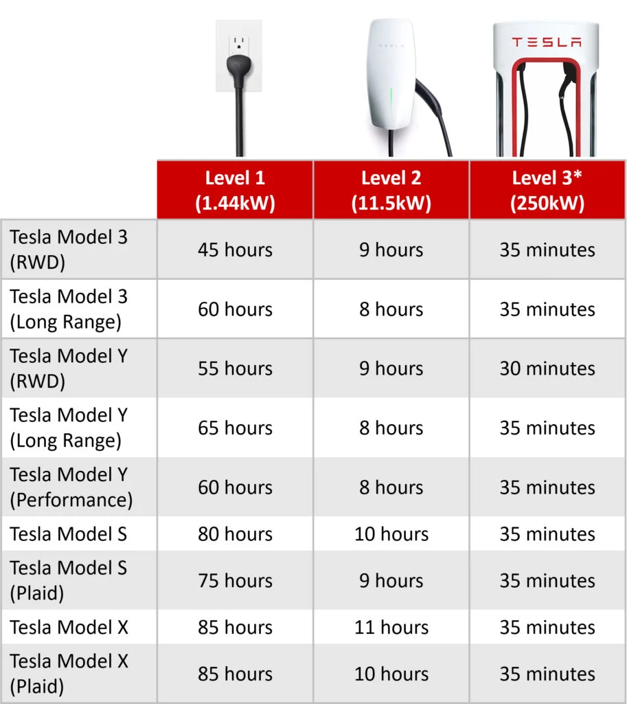 | Tesla Model | Approx. Battery Size | Level 2 Charge Time (0–100%) | Supercharger Time (10–80%) |